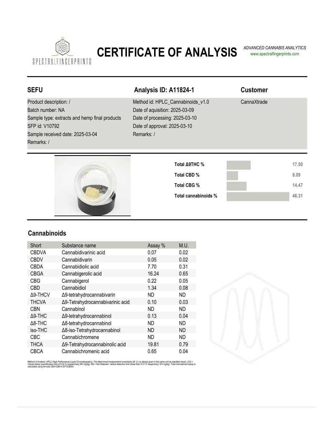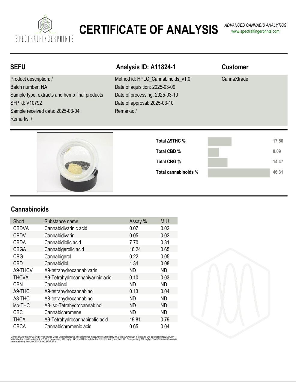 Denne THCA hash er avlet på en af Europas største og anderkendte hashfarme i Frankrig og indeholder følgende: